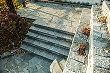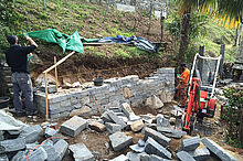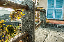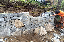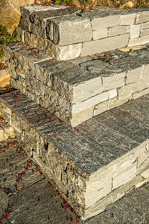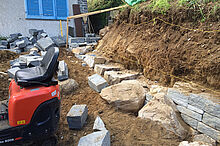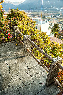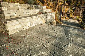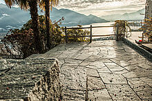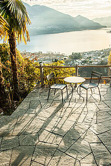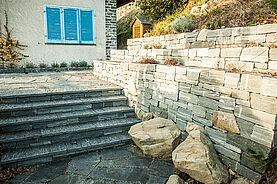 Ein Garten im Südhang hoch über dem Lago Maggiore sollte auf Wunsch des Auftraggebers in neuer Frische erscheinen. Mit einer Umgestaltung soll der eher kleinräumige Garten offener, heller und einladender werden. Zudem wurde eine pflegeleichte Variante gewünscht. Von der Grundgestaltung her wurde eine klassische Variante mit klaren Linien und ortsüblichen Materialien gewählt. Die einzelnen Bereiche wie Sitzplatz, Treppe und Trockenmauer wurden möglichst grosszügig gestaltet um mehr erlebbaren Raum zu schaffen. Durch das Muster der Mosaiksteinplatten, abgestufter Mauer mit Pflanzbereichen und grossen Steinbrocken, die freigelegt an ihrem Ort belassen sind, wurden die geraden Linien und Flächen etwas spielerisch durchbrochen. Die Bepflanzung ist wurde sehr zurückhaltend gewählt, da die Anlage aber ausschliesslich in Trockenbauweise erstellt wurde wird sich mit der Zeit Leben mit wärmeliebenden Pflanzen und Kleintieren bilden können.